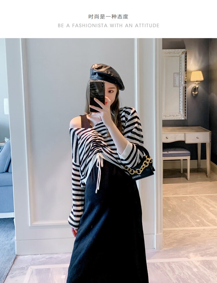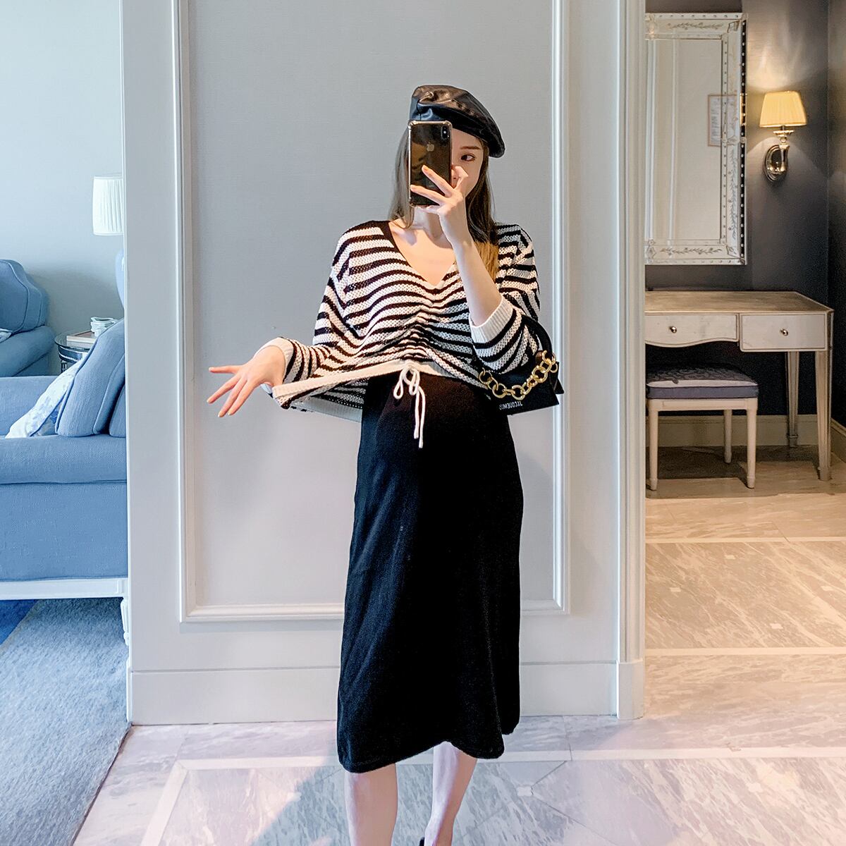 おしゃれ かわいい マタニティウェア オータムニットスカート ストライプギャザートップス 薄手ニット 秋物 hotmom53705756863