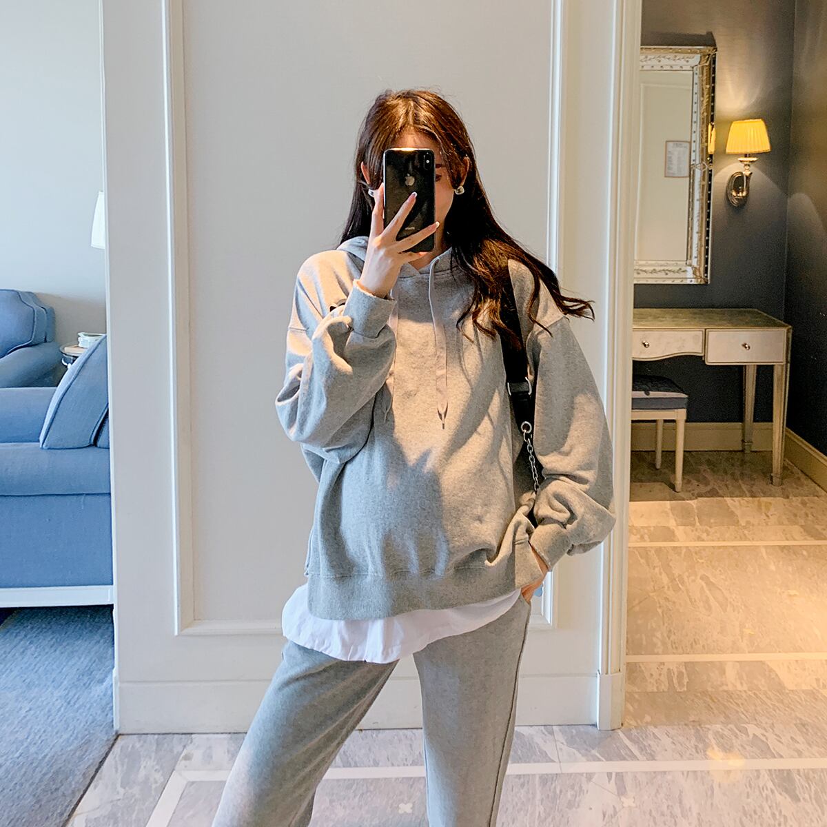 色:グレーのセーター,白いセーター,ライトグレーパンツ,グレーのセーター+ライトグレーのパンツ,ホワイトセーター+ライトグレーパンツ,黒いズボン,グレーのセーター+黒のパンツ,白いセーター+黒のズボン