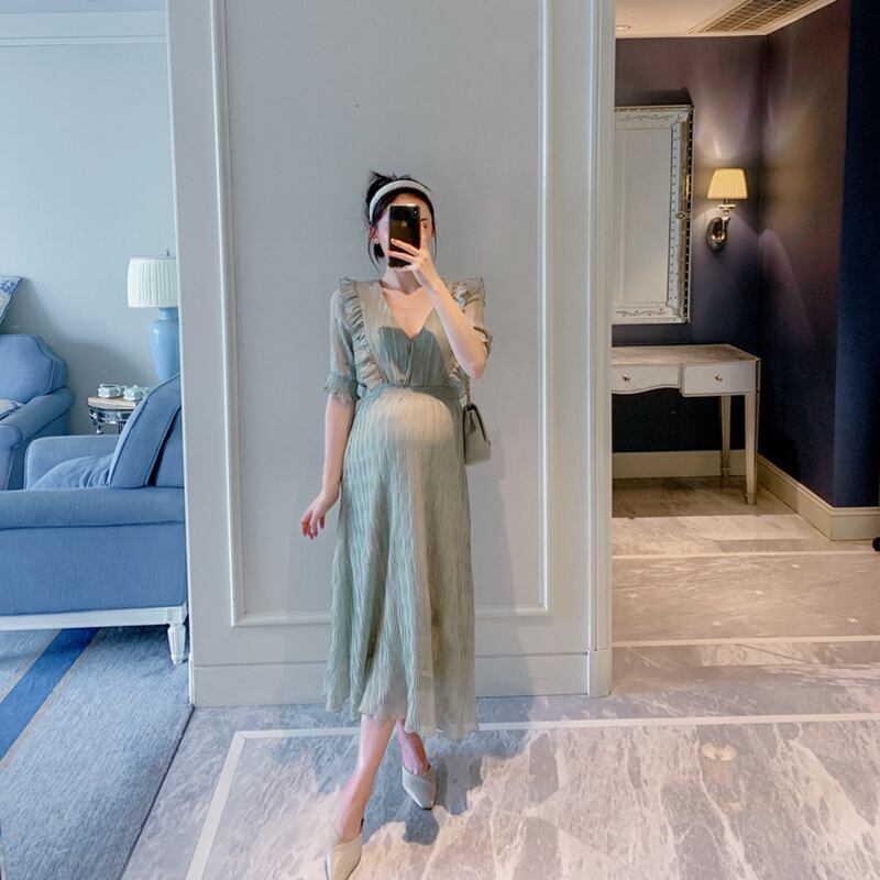 おしゃれ かわいい マタニティウェア ドレス サマールーズレースVネックスカート 夏物 hotmom61925386405