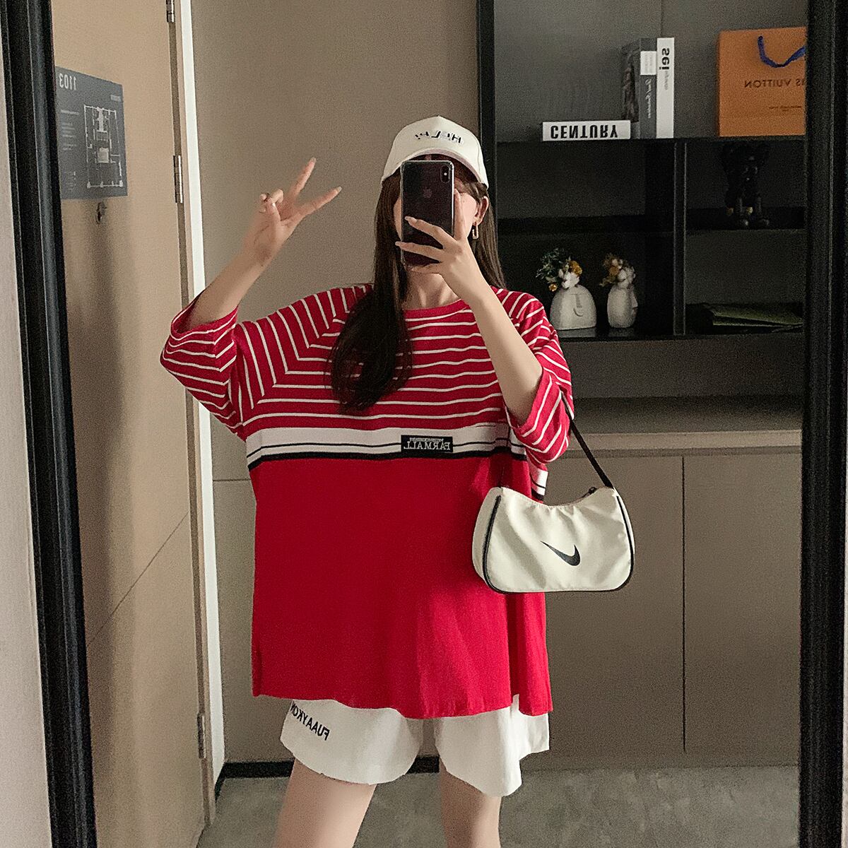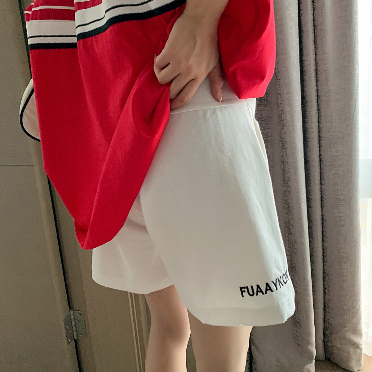 色:赤いTシャツ,ホワイトショーツ,赤いTシャツ+白いパンツ