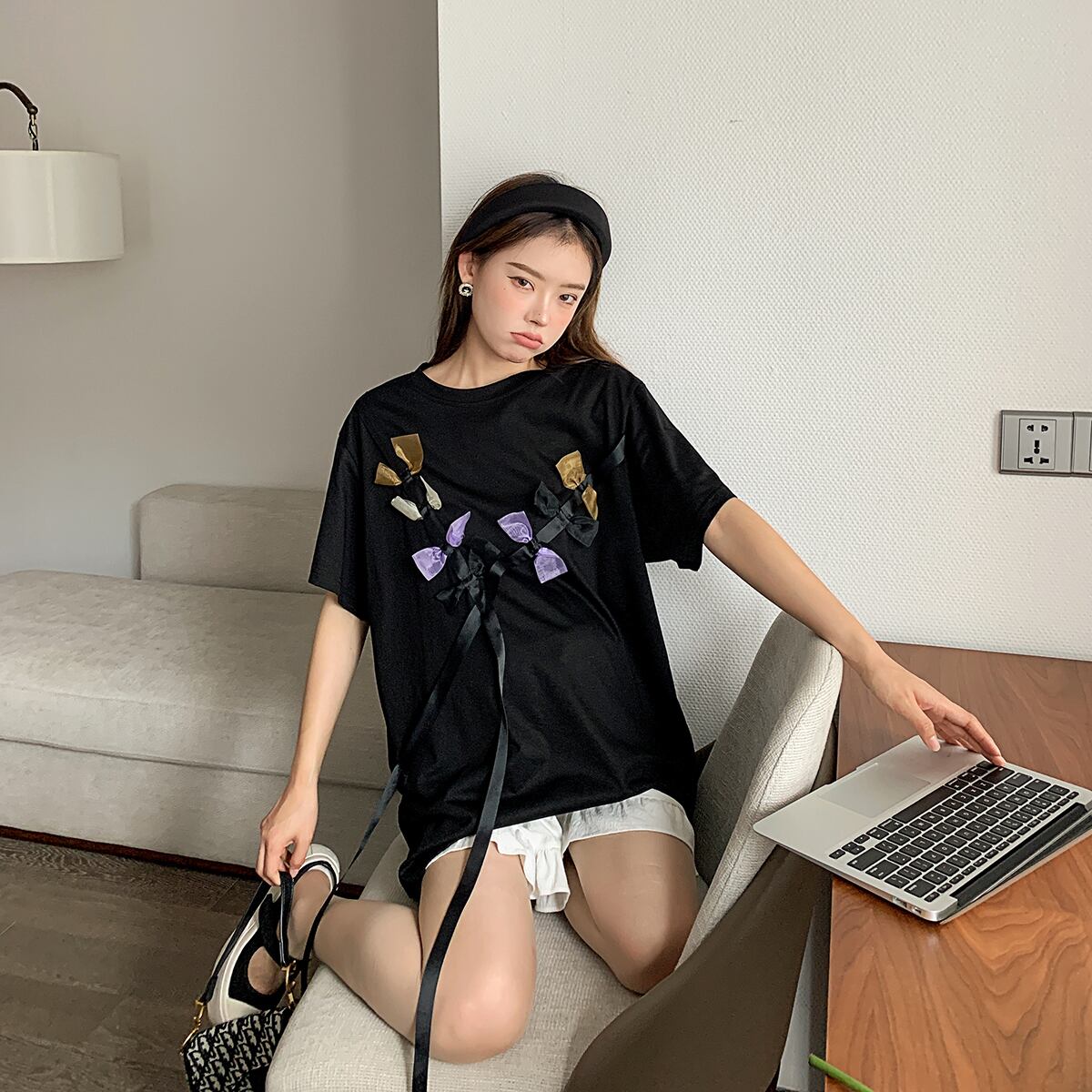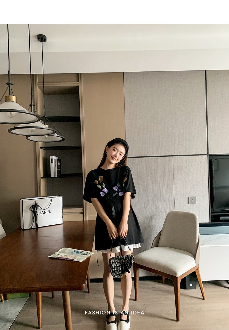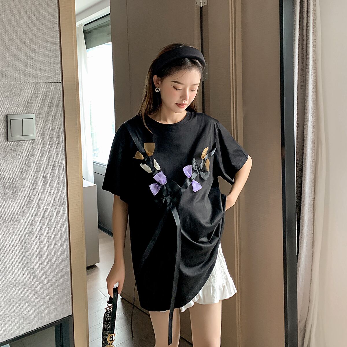 おしゃれ かわいい マタニティウェア ドレス サマー薄手ルーズブラックリボンTシャツ スカート 夏物 hotmom4346534700