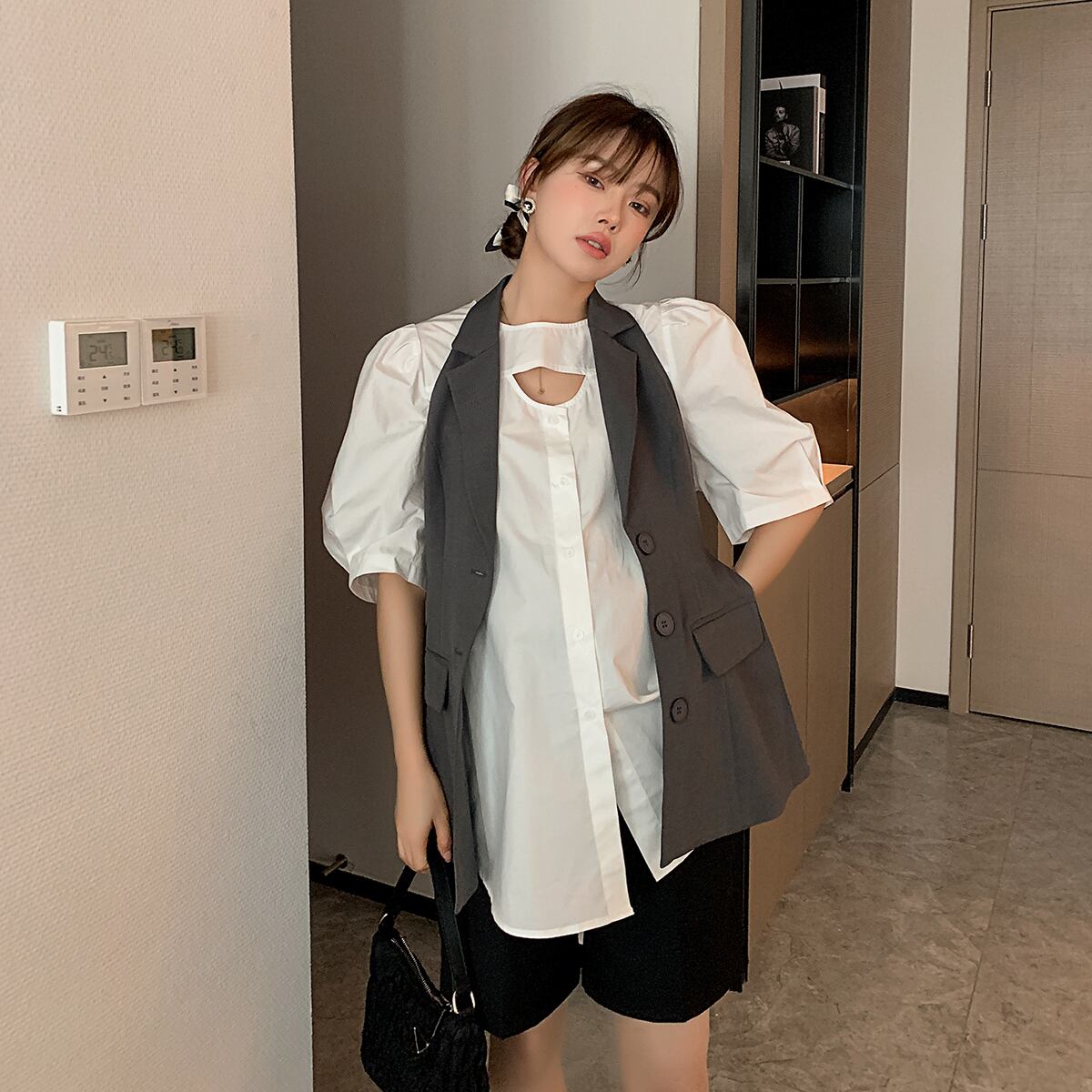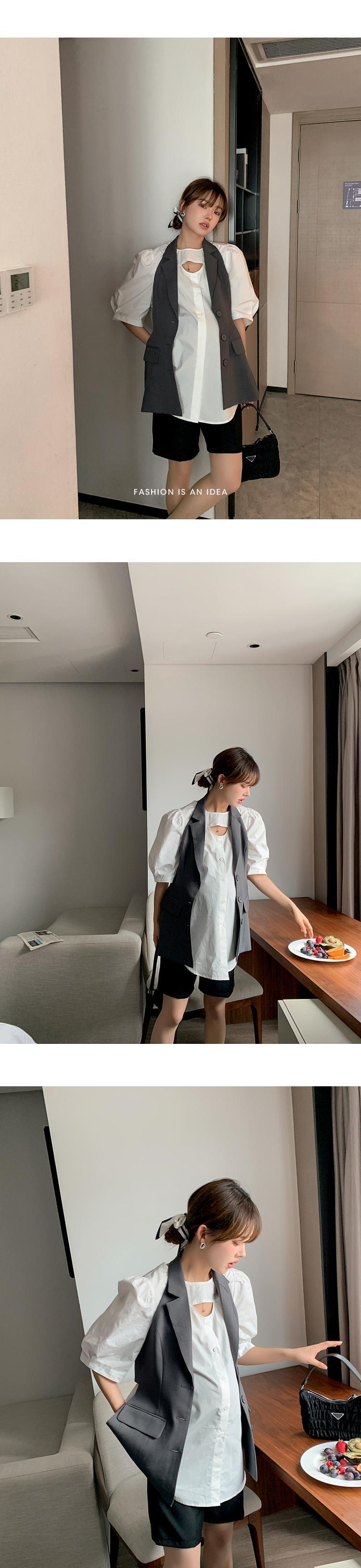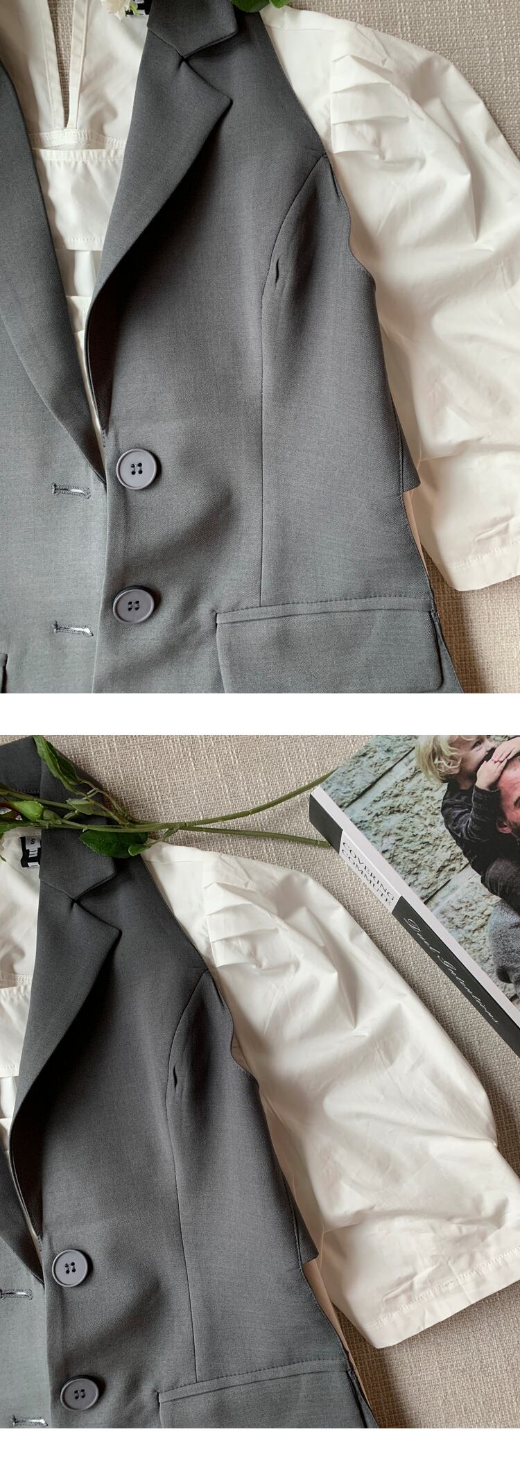 色:ツーピースライトグレーベストトップ,黒いズボン