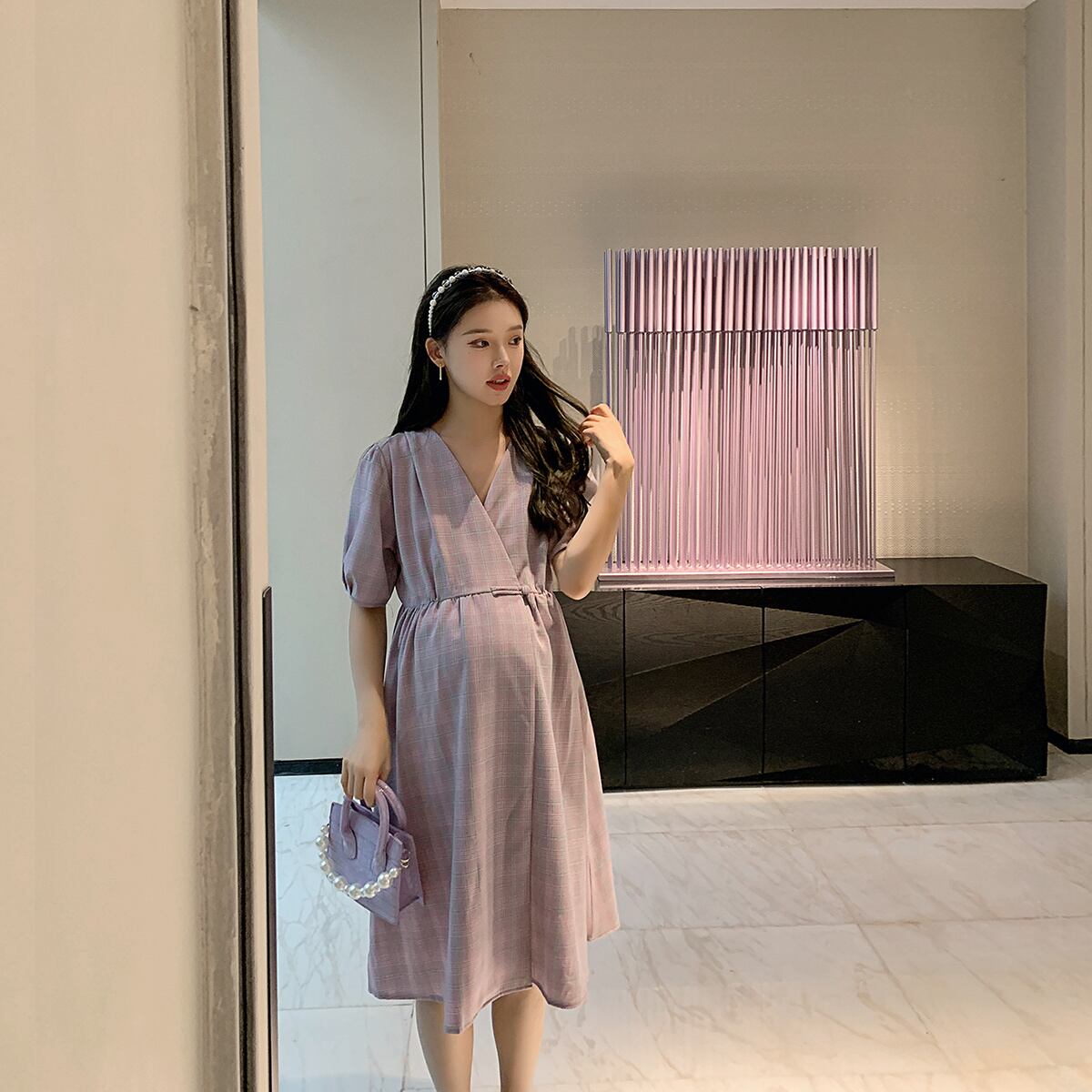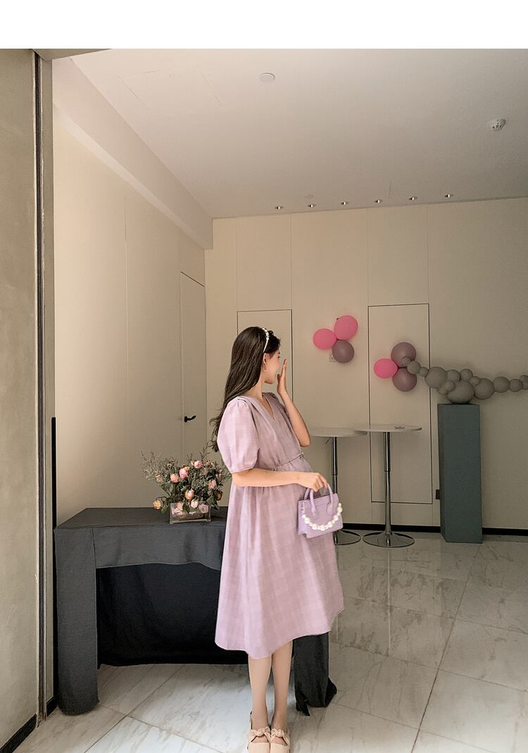 おしゃれ かわいい マタニティウェア サマードレス 薄手Vネックワンピース格子柄ルーズ 大きめサイズ 夏物 hotmom61594004228