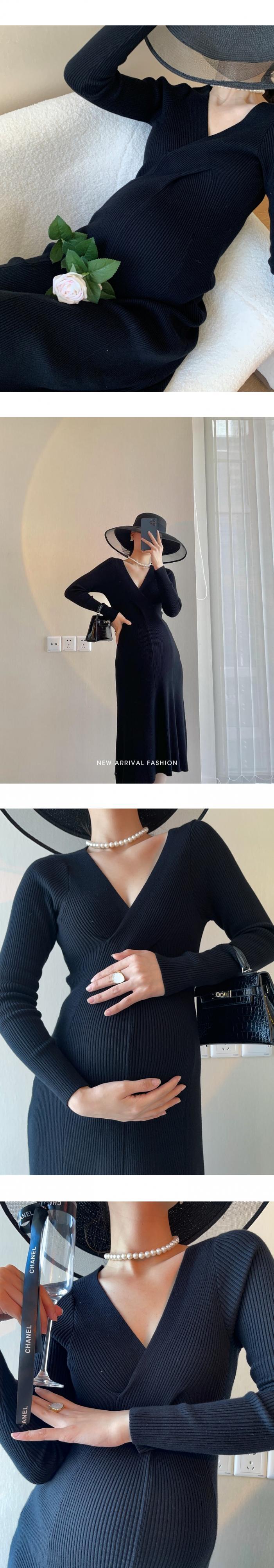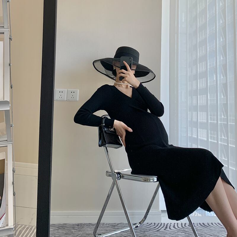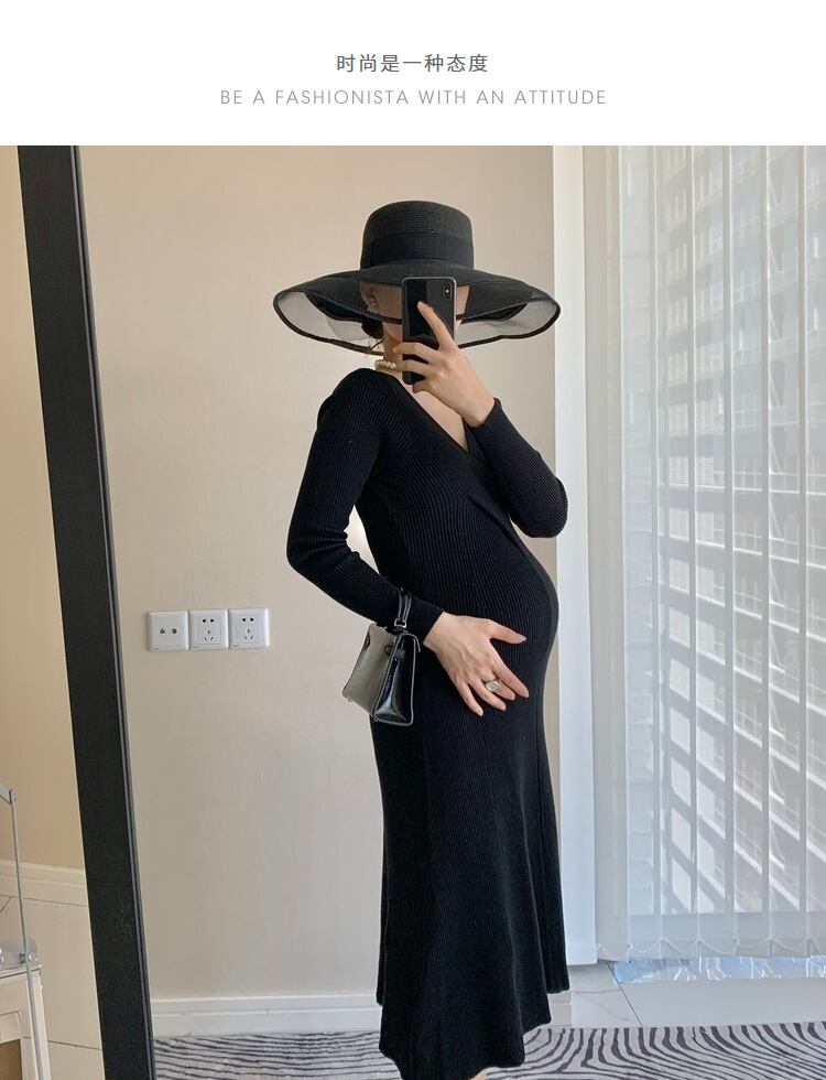 おしゃれ かわいい マタニティウェア オータムドレス ニットスカート Vネックスリム ロング 秋物 hotmom83860393596