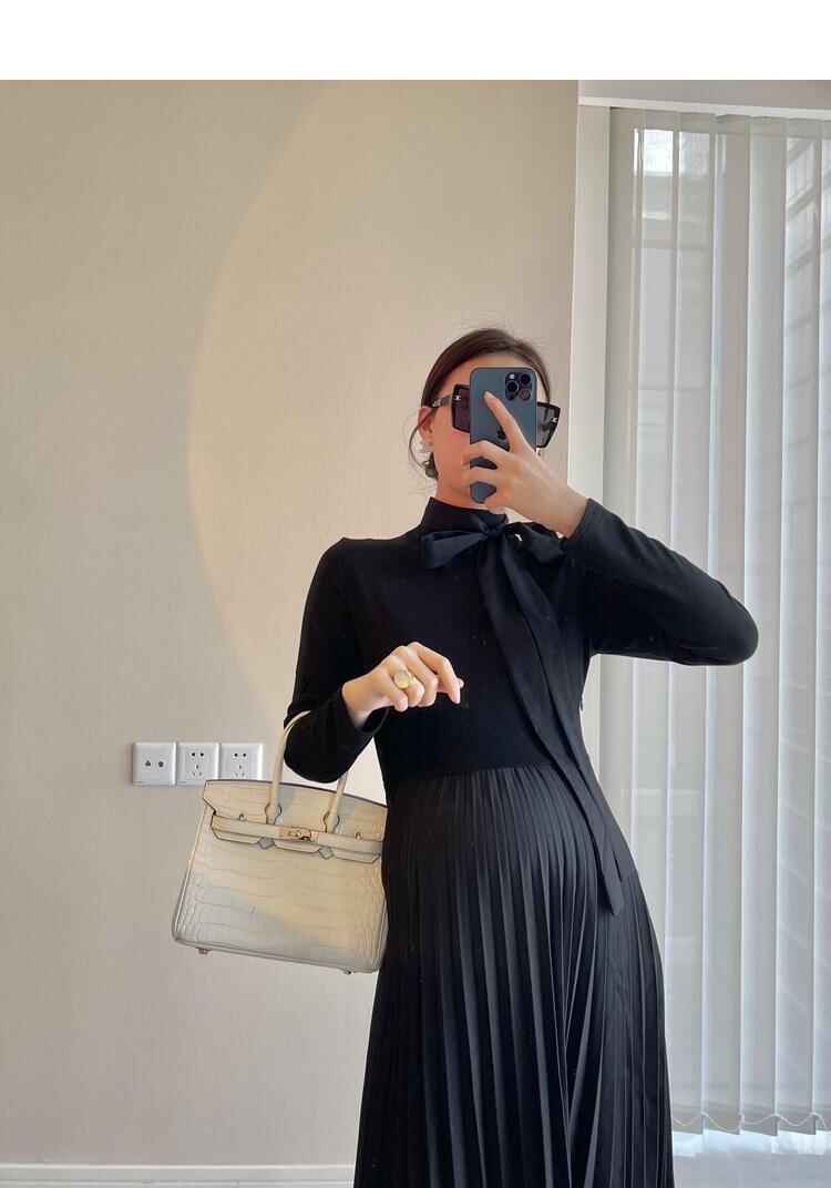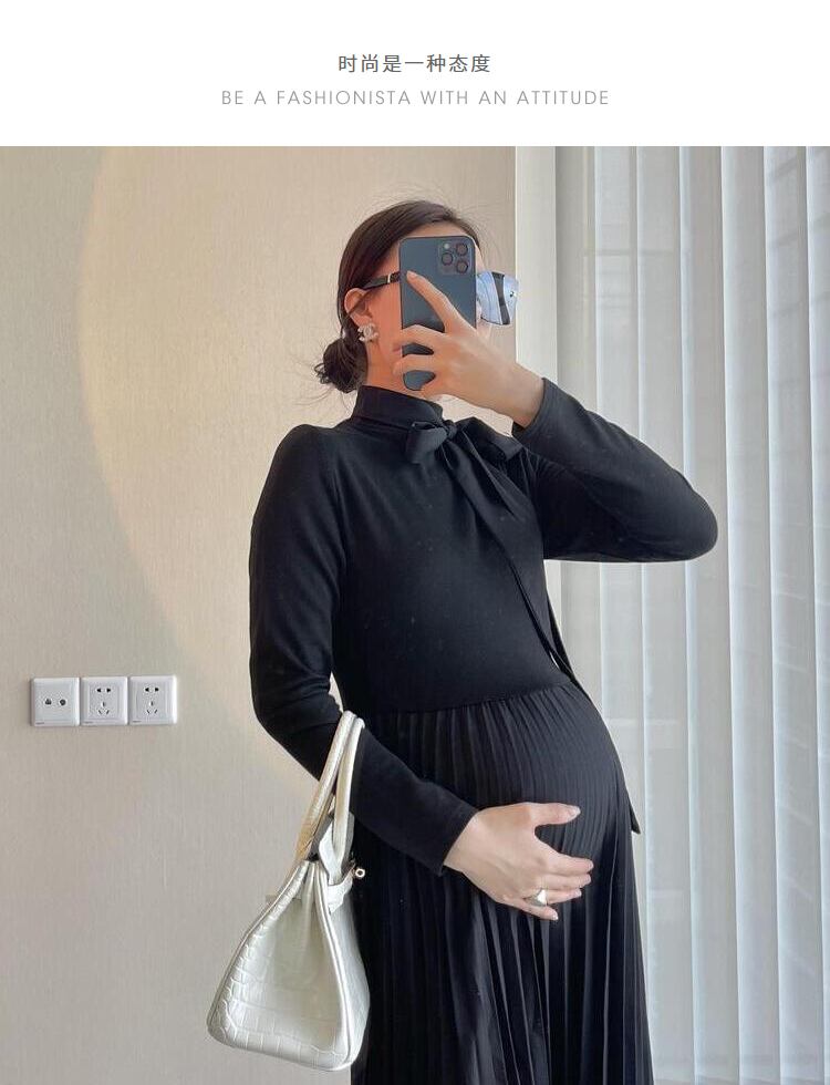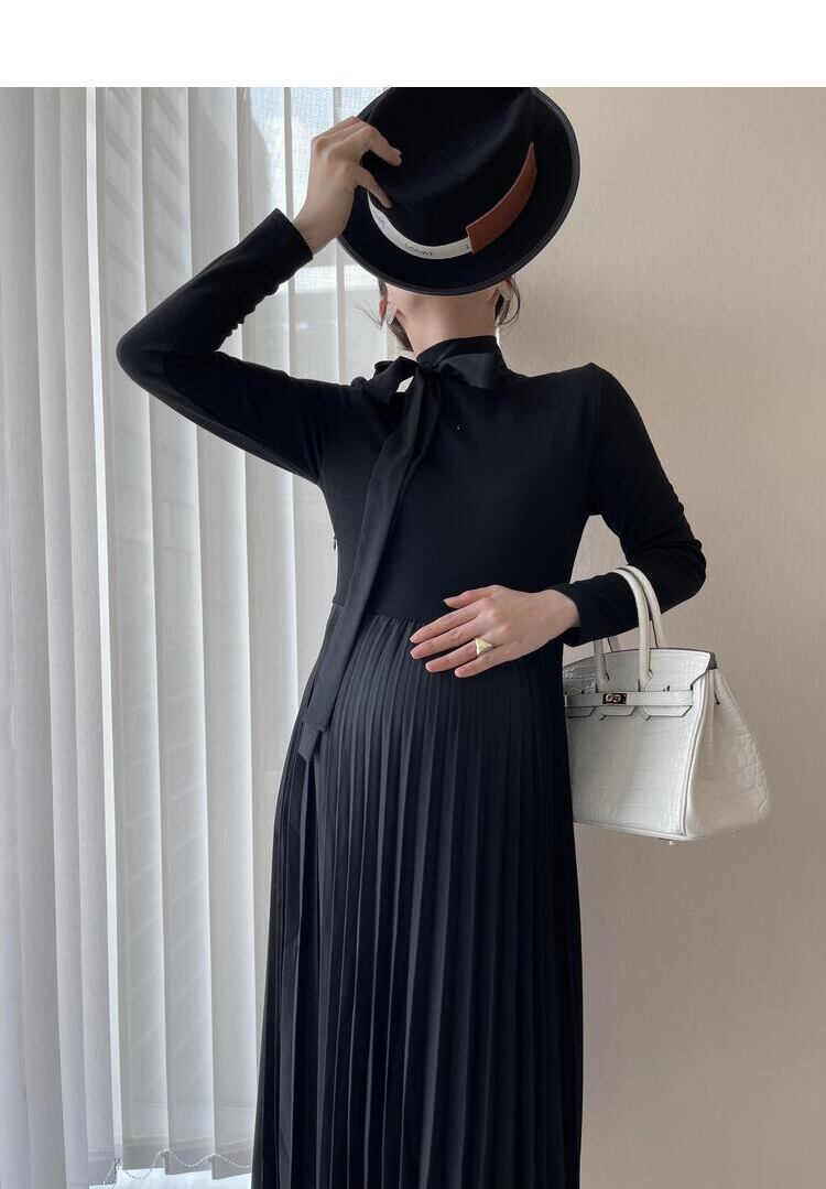 おしゃれ かわいい マタニティウェア オータムニットプリーツスカート ブラックドレス ロング 秋物 hotmom22883875285