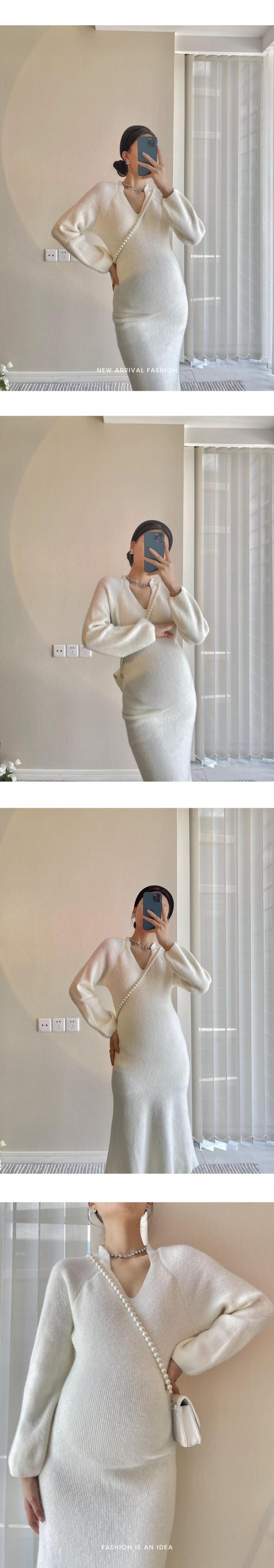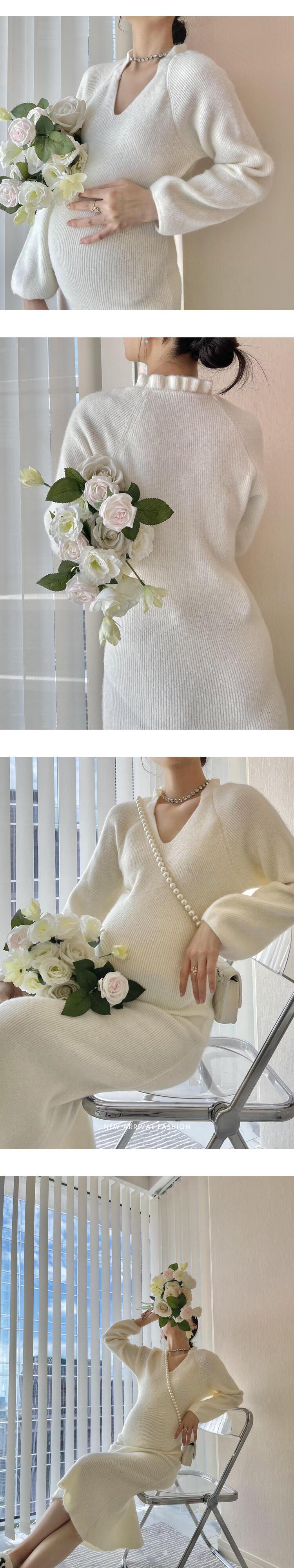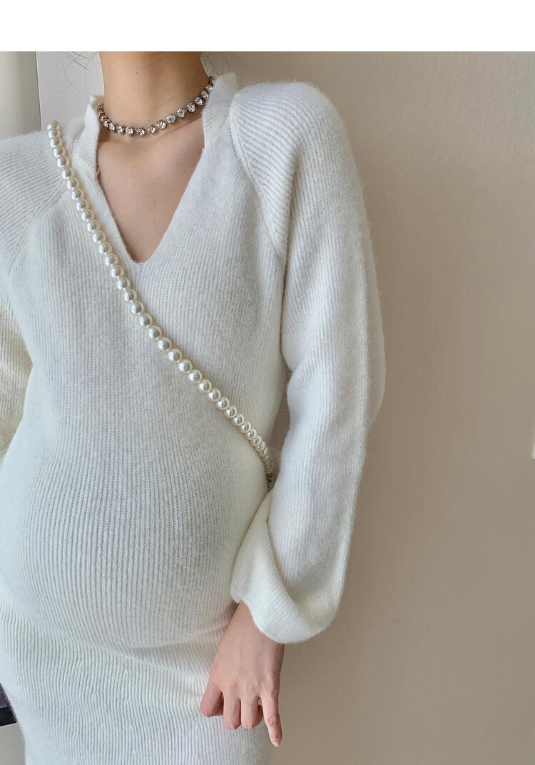おしゃれ かわいい マタニティウェア オータムドレス ベージュVネックスリーブセーター ランタンスリーブ 秋物 hotmom63954100188